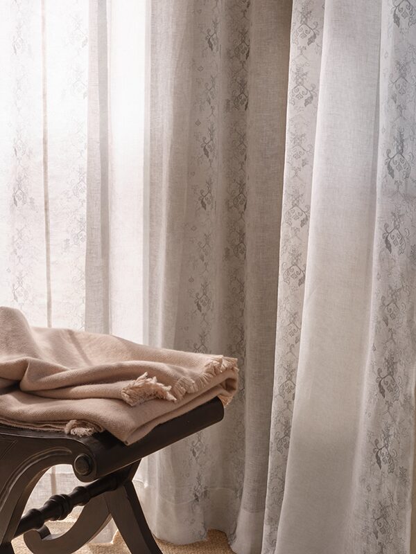 DESERT ETCHING: This lightweight sheer of fine linen yarns features a delicate pencil sketch design on a subtly textured, softly coloured background. The finely drawn etching appears gracefully eroded with the passage of time.