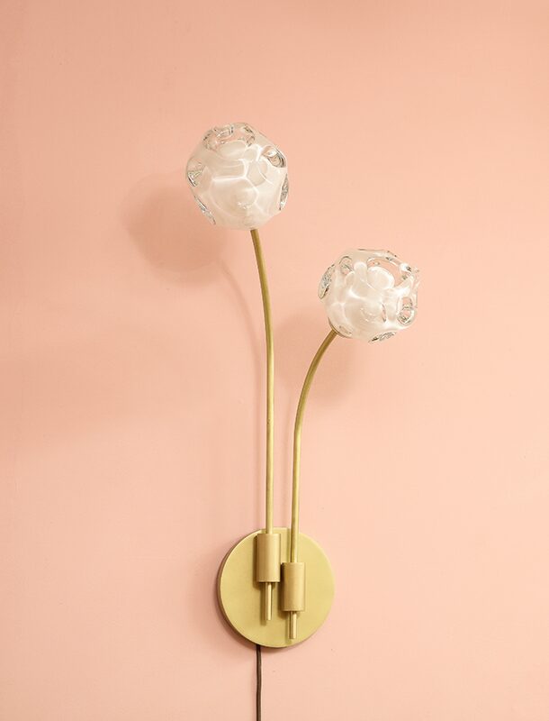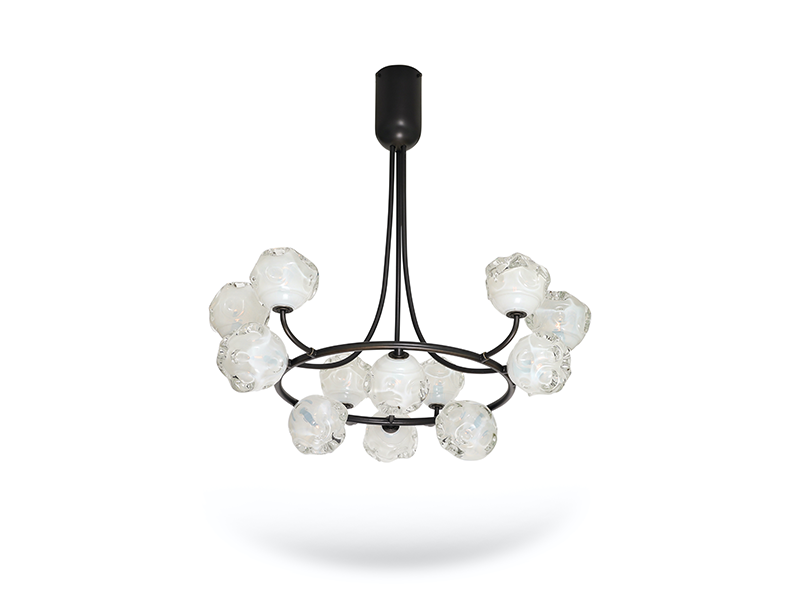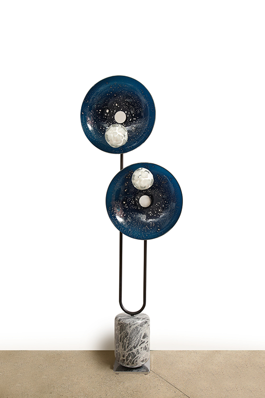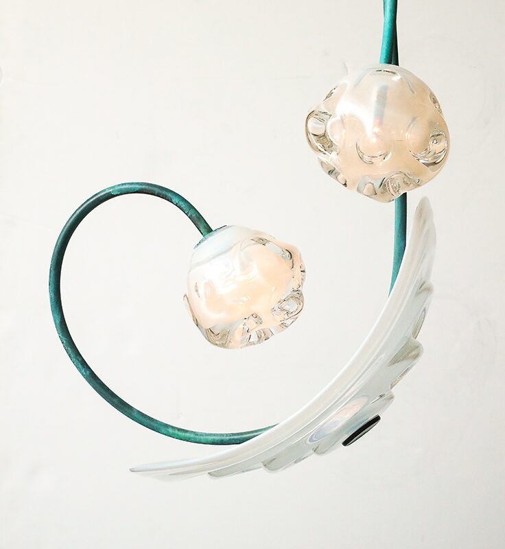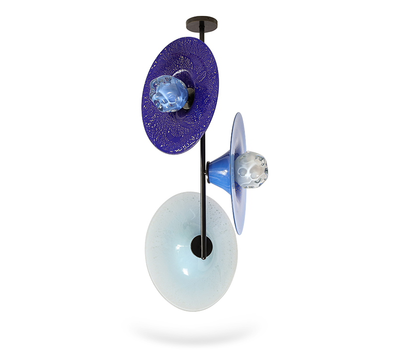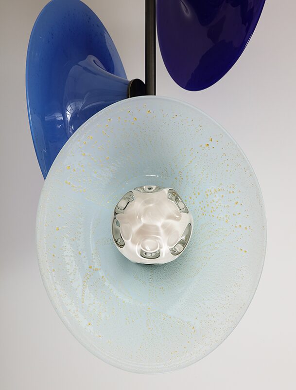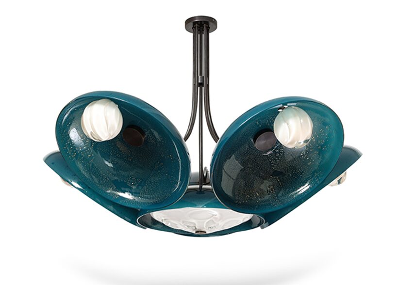 The exhibition includes chandeliers, pendant lighting, sconces, and a floor lamp, all featuring his technically intricate Morel shapes and beautifully colored glass bowls embedded with a variety of metallic foils. “Silverman is among the next generation of glass artists destined to be a big name. With this show, you see more of the artist’s hand in the work—Lorin has pushed his technical prowess on many of the newer pieces, and I hope people will be able to see that. We expect this to be a real breakout moment for him, ” says Paul Donzella, founder of Donzella Ltd.