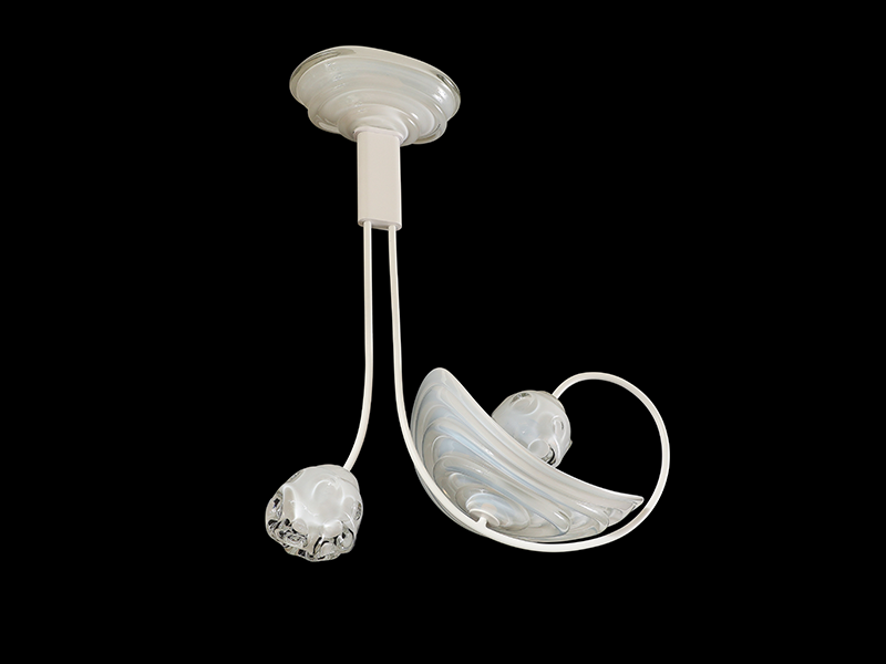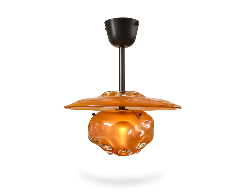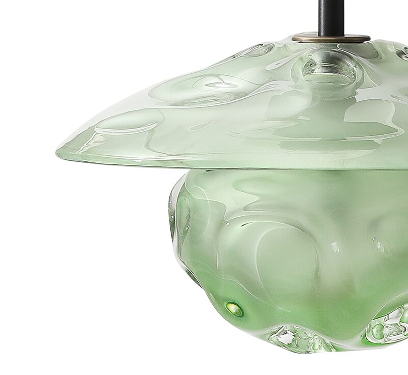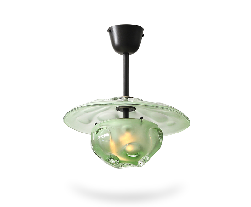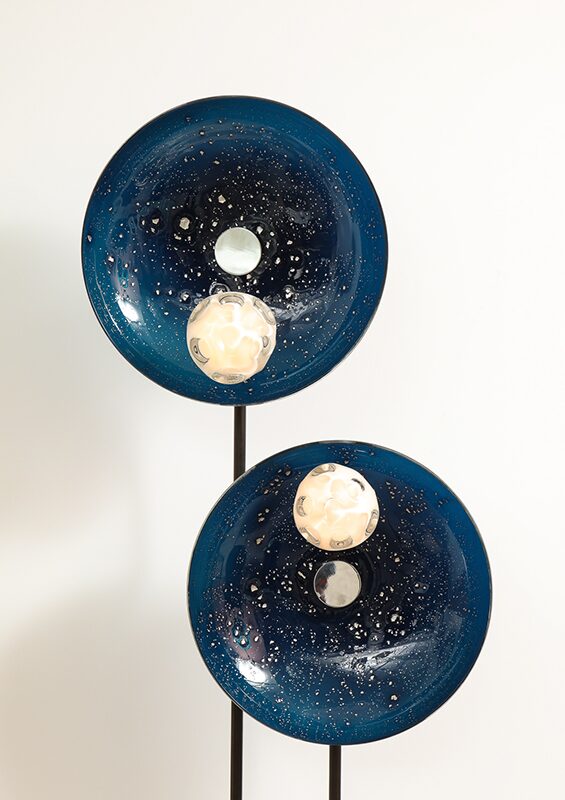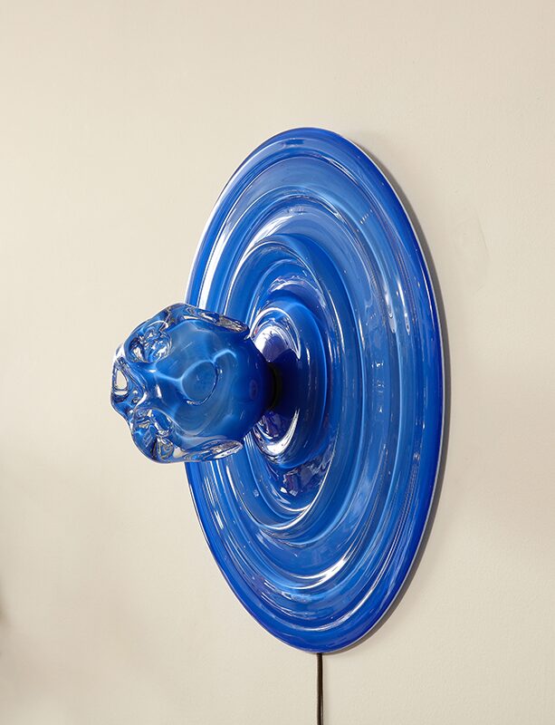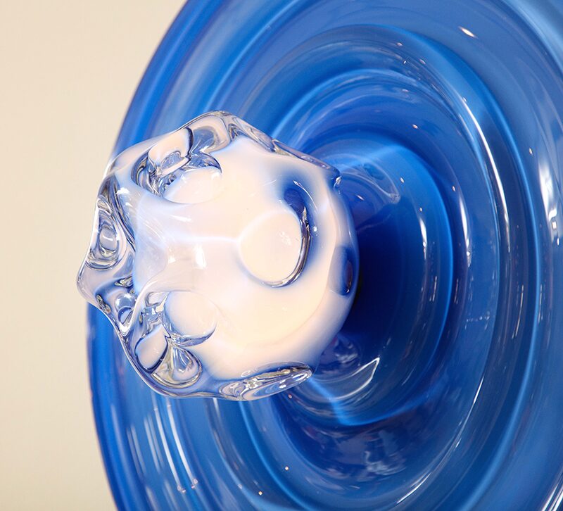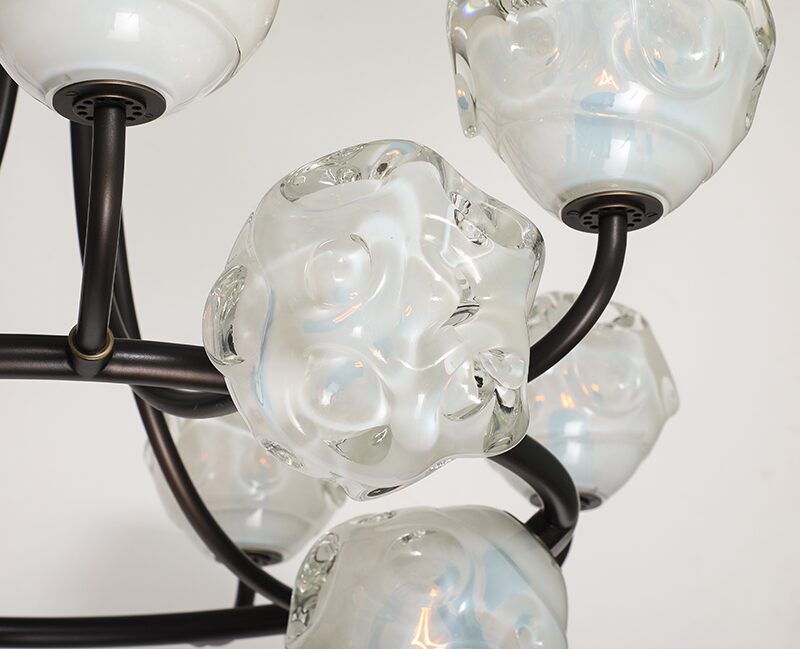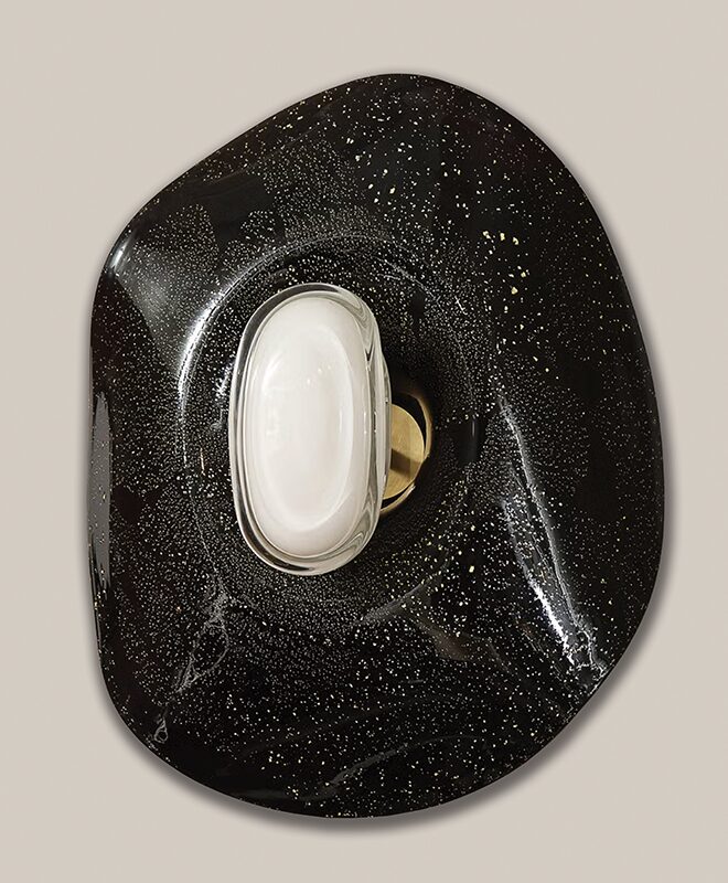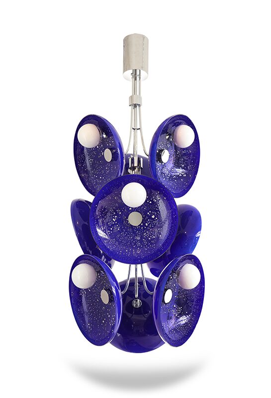 This series marks a pivotal moment in the artist’s career, having evolved from making functional lighting to creating ambitious sculptural works that push the boundaries of contemporary glass. Rippling surfaces and refracted light evoke water, memory, the night sky, and natural phenomena, while meticulously engineered fittings root the pieces in rigorous design. His process blends technical precision with an openness to chance, working with CAD renderings and machinists for fittings, while insisting on the hand-made integrity of each glass form. He embraces both the heritage of Venetian craft and the freedom of contemporary experimentation, situating his work in dialogue with figures such as Dale Chilhuly, Jeff Zimmerman, and Lindsey Adelman.